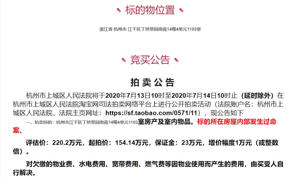 比如,此前,杭州市江干区丁桥景园南苑成交的一套建筑面积约93平方米的法拍房,获得5万人围观,最终以总价222万元成交,这套房子在拍卖公告中就以红色字体标注房屋内部发生过命案。