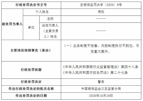 10月27日消息,银保监会官网公布信息显示,农行三亚分行因业务制度不完善、内控制度执行不到位,引发重大案件等原因,被三亚监管分局连开9张罚单,被处罚金150万。