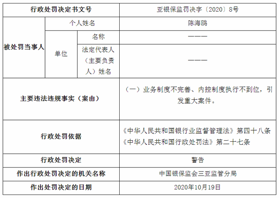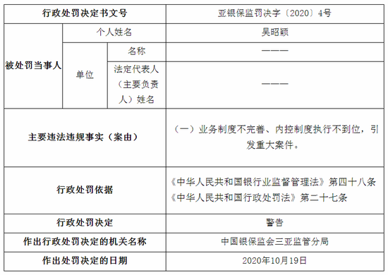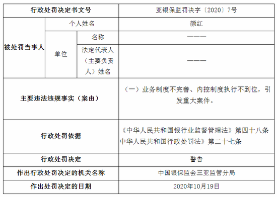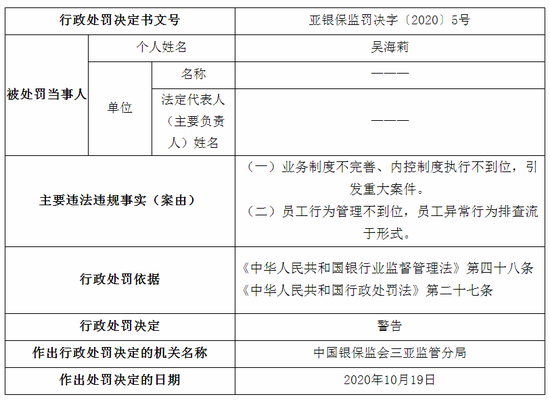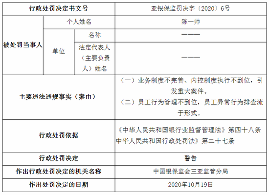 蒲喜民,因利用职务上的便利,侵占、挪用客户资金,构成重大案件,被禁止终身从事银行业工作。王小兰、吴昭颖、吴海莉、陈一帅、颜红、陈海鸥、周权等7人,因业务制度不完善、内控制度执行不到位,引发重大案件,被三亚监管分局予以警告。