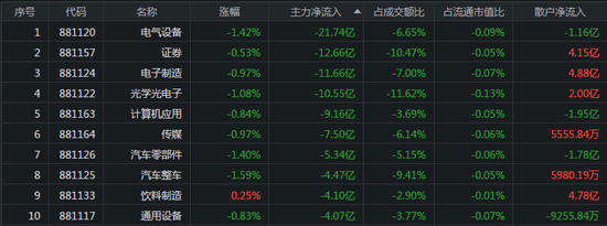 主力资金流出的板块分别是电气设备、证券、电子制造,主力资金流出金额分别为21.74亿元、12.66亿元、11.66亿元,其中散户净流入金额为-1.16亿元、4.15亿元、4.88亿元。