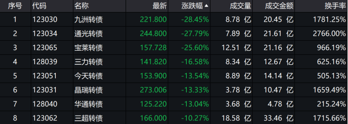 其中,此前曾因涨幅超过限制而多次“熔断”的九洲转债因跌幅超过限制被两次临停,收盘时居27日可转债跌幅榜榜首。