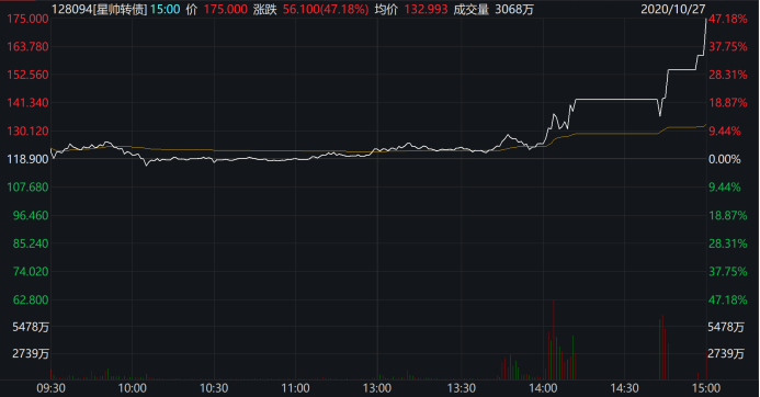 星帅转债午后开始有资金介入,于14时12分55秒和14时46分26秒两度盘中临时停牌,截至收盘,上涨47.18%。