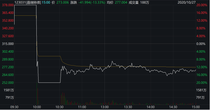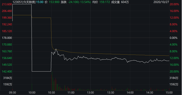 另外,晶瑞转债、今天转债在盘中上演了“天地板”,开盘一度涨20%触发临停,复牌后直线跳水转跌20%,其中今天转债从涨20%到跌20%仅用时一分钟。