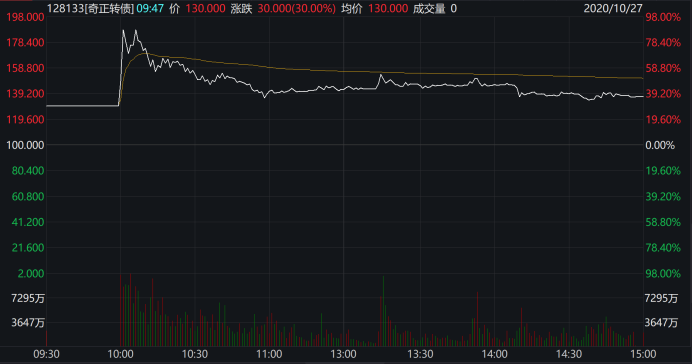 奇正转债27日是上市首日,开盘即上涨30%触发盘中临时停牌,复牌后涨幅一度接近50%,截至收盘,上涨37.1%。