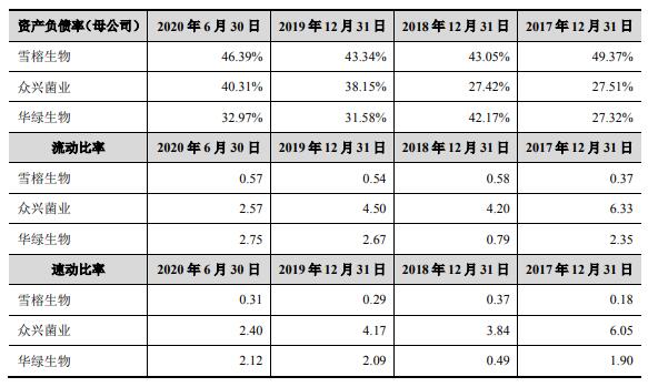 2014年末、2015年末、2016年末、2017年末、2018年末、2019年末、2020年6月末,同行业可比上市公司中,雪榕生物流动比率(倍)分别为0.36、0.34、0.43、0.37、0.58、0.54、0.57,众兴菌业流动比率(倍)分别为2.77、1.92、4.34、6.33、4.20、4.50、2.57;雪榕生物速动比率(倍)分别为0.21、0.16、0.31、0.18、0.37、0.29、0.31,众兴菌业速动比率(倍)分别为2.42、1.74、4.14、6.05、3.84、4.17、2.40。