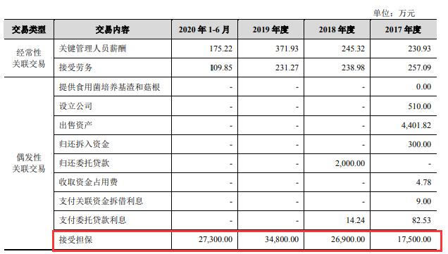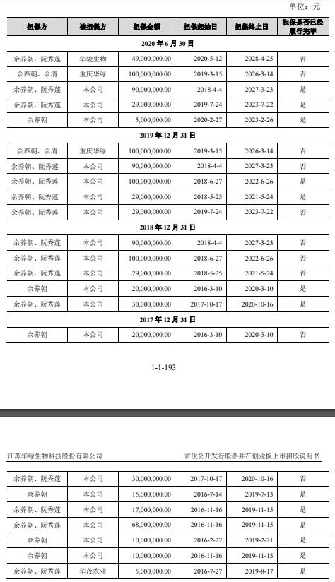 公司有多起关联担保。华绿生物称,因公司生产经营的资金需要,公司控股股东、实际控制人余养朝及其妻子阮秀莲,公司监事、重庆华绿总经理余清为公司及其子公司提供了担保。2017年末、2018年末、2019年末、2020年6月末,华绿生物接受担保金额分别为1.75亿元、2.69亿元、3.48亿元、2.73亿元。