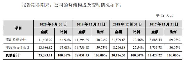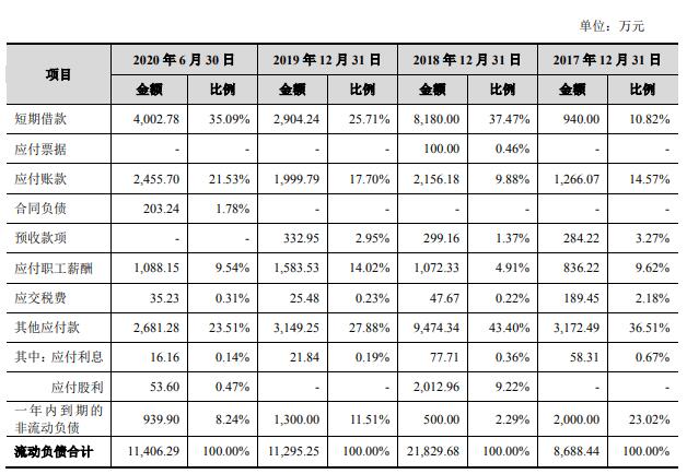 2014年末、2015年末、2016年末、2017年末、2018年末、2019年末、2020年6月末,华绿生物流动负债分别为1.32亿元、1.46亿元、1.19亿元、8688.44万元、2.18亿元、1.13亿元、1.14亿元,流动负债占负债总额的比例分别为66.63%、81.41%、70.65%、69.93%、72.46%、40.27%、44.92%;流动负债中,短期借款分别为6500万元、6000万元、6290万元、940万元、8180万元、2904.24万元、4002.78万元。