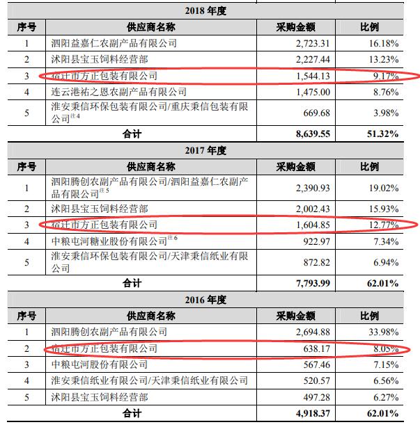 2016年、2017年、2018年,宿迁市方正包装有限公司分别是华绿生物的第二大供应商、第三大供应商、第三大供应商,采购金额分别为638.17万元、1604.85万元、1544.13万元。