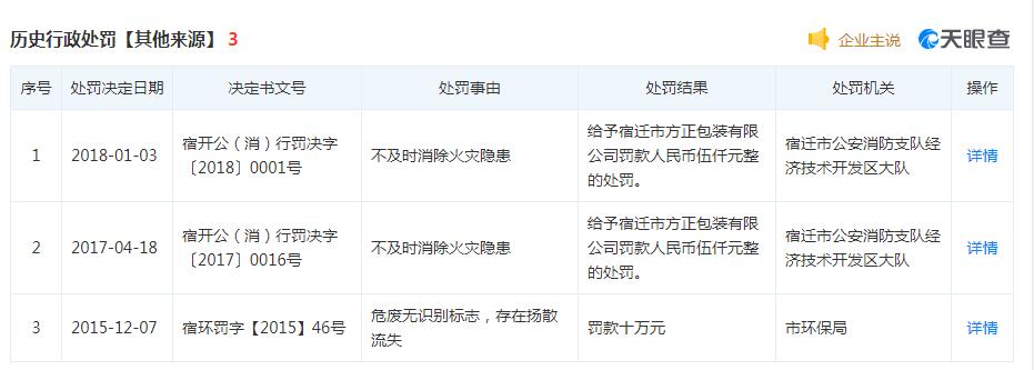 中国经济网记者查询天眼查发现,宿迁市方正包装有限公司曾被处罚。2015年12月7日,因危废无识别标志,存在扬散流失,该公司被罚款10万元。2017年4月18日和2018年1月3日,因不及时消除火灾隐患,该公司分别被罚5000元。