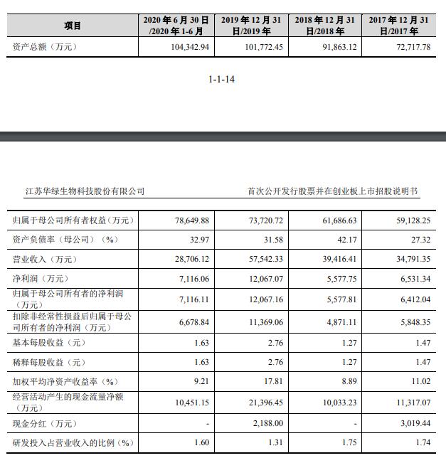 2014年、2015年、2016年、2017年、2018年、2019年、2020年1-6月,华绿生物实现归属于母公司所有者的净利润分别为3214.23万元、5166.36万元、6328.24万元、6412.04万元、5577.81万元、1.21亿元、7116.11万元,经营活动产生的现金流量净额分别为6922.46万元、9712.87万元、1.08亿元、1.13亿元、1.00亿元、2.14亿元、1.05亿元。