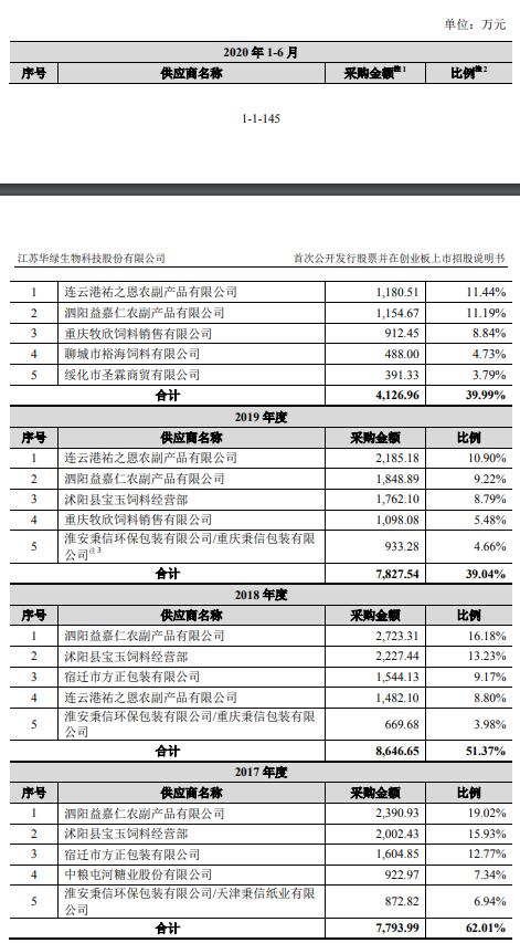 2014年、2015年、2016年、2017年、2018年、2019年、2020年1-6月,华绿生物前五大供应商采购金额占比分别为40.55%、51.28%、62.01%、62.01%、51.37%、39.04%、39.99%。