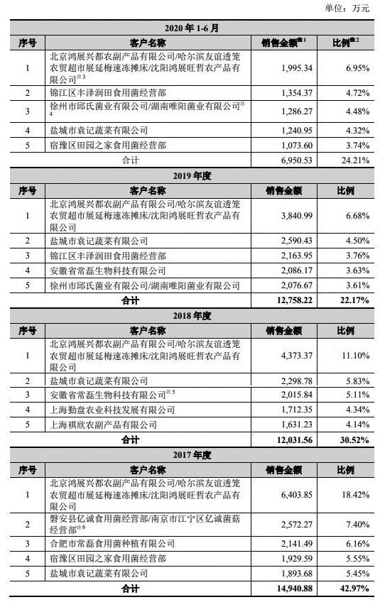 在上会稿中,华绿生物表示,公司食用菌产品市场认可度较高,销售情况良好,但因产能限制,2016年及之前,公司生产的食用菌产品在销售中会优先保障区域内规模较大、实力较强的经销商之供应,随着公司产能的不断增加以及销售渠道的持续拓展,报告期内销售收入持续增长,单一客户的销售占比有所下降,公司前五大销售占比呈现下降趋势。报告期各期公司前五大客户存在一定变化,前五大客户销售情况变化一是因为报告期内公司江苏四厂、重庆工厂投产,新设工厂向周边地区销售增加,相关经销商销售规模有所增加;二是因为公司调整市场重心,加大了对重点市场的销售,减少了对非重点市场的销售;三是因为客户加大下游销售渠道拓展等客户自身因素。