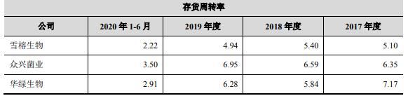 各期,华绿生物存货周转率(次)分别为7.81、7.31、6.46、7.17、5.84、6.28、2.91。同行业可比上市公司中,雪榕生物存货周转率分别为6.25、5.36、5.30、5.10、5.40、4.94、2.22;众兴菌业存货周转率分别为6.41、6.22、5.82、6.35、6.59、6.95、3.50。