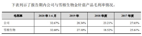 华绿生物表示,公司金针菇产品的毛利率变化趋势和雪榕生物金针菇产品的毛利率变化情况相一致。2017年度至2019年度,公司金针菇产品的毛利率总体高于雪榕生物,主要系多种因素带来的农产品售价和成本差异所致。2020年1-6月,公司金针菇产品毛利率与雪榕生物金针菇产品毛利率基本一致。