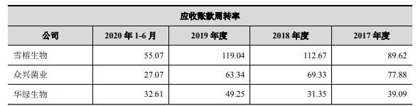 华绿生物表示,公司应收账款周转率低于同行业可比上市公司,主要系公司成立时间较短、规模相对雪榕生物和众兴菌业等较小,因此给予经销商略长的信用期以拓展市场。2020年1-6月,公司应收账款周转率已高于众兴菌业。报告期内,公司应收账款回款情况良好,应收账款周转天数较短,账龄基本均在6个月以内。