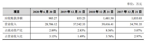 公司应收账款周转率低于可比上市公司,并且差距较大,仅为同行均值的三分之一。2014年末、2015年末、2016年末、2017年末、2018年末、2019年末、2020年6月末,华绿生物应收账款净额分别为528.89万元、677.29万元、746.99万元、1033.03万元、1481.50万元、855.25万元、905.27万元,占营业收入比分别为2.76%、2.82%、2.81%、2.97%、3.76%、1.49%、3.15%。