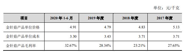 金针菇是公司主营业务收入的最主要来源,历年占公司主营业务收入的比例均在91%以上。2016年-2019年,公司金针菇单价持续下滑,金针菇产品毛利率波动起伏。2014年、2015年、2016年、2017年、2018年、2019年、2020年1-6月,华绿生物金针菇产品的单位价格(元/千克)分别为5.98、6.05、5.59、5.13、4.83、4.79、4.91;金针菇产品毛利率分别为30.95%、36.62%、36.19%、27.65%、23.21%、28.34%、32.67%。同期,可比公司雪榕生物的金针菇产品毛利率分别为29.71%、34.70%、32.49%、25.61%、18.52%、27.10%、32.68%。