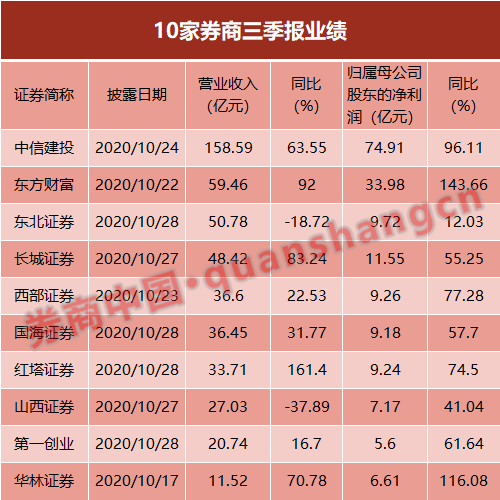截至10月27日晚间,至少有10家券商已公布三季报,各家券商前三季度净利润均有不同程度的增长。