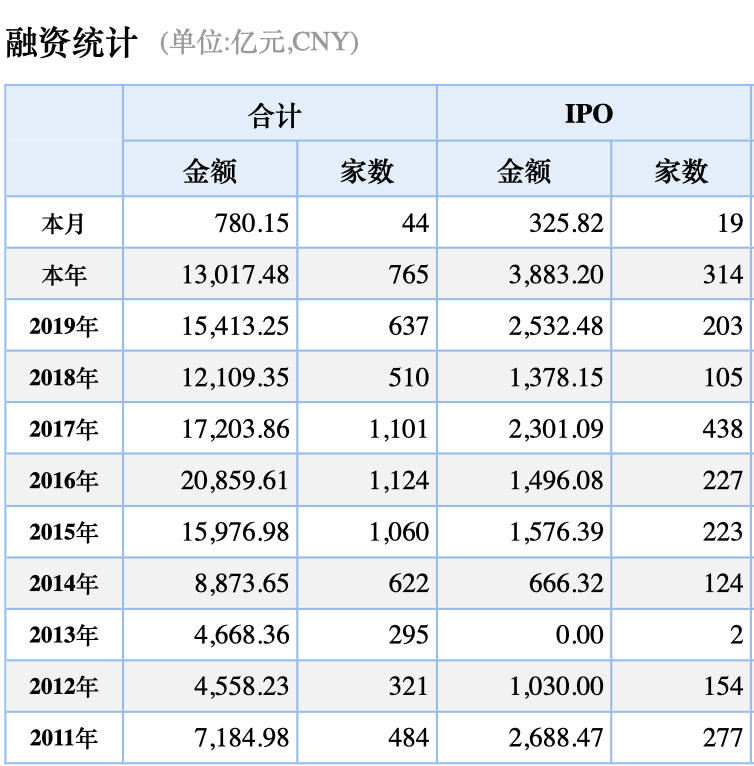 而注册制的全面推进和新三板公开发行的落地,也进一步催热了今年一级市场的红火态势。截至10月27日,wind数据显示,年内已有765个股权融资项目落地,总金额为1.3万亿元,已经超过2018年全年总金额。其中共有314个IPO项目,远远超过2019年的203个项目,IPO融资规模也达到了3883.2亿元,相比去年全年的2532.48亿元,增幅为53.33%。