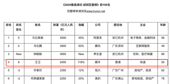 上周公布的《2020胡润百富榜》,也出现了有意思的一幕。顺丰创始人王卫的财富涨幅高达118%,并以2400亿元位列榜单第4位,比上年提高8个位次,是榜单上居住地为香港中排名最靠前的富豪。不过,王卫是持有香港身份证,并非实际居住在香港。