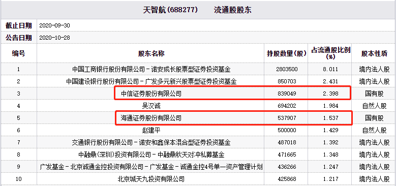 天智航前十名流通股股东持股情况中,其第三大流通股股东为中信证券,持股数量为83.90万股,占流通股比例2.40%;第五大流通股股东为海通证券,持股数量为53.79万股,占流通股比例1.54%。