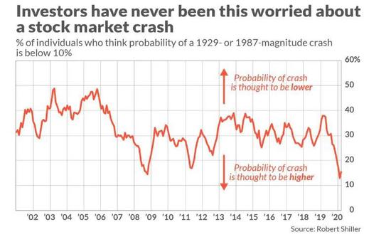 来自耶鲁大学金融学教授(也是诺贝尔奖获得者)Robert Shiller和他的同事们称之为“美国股市崩盘信心指数”的调查显示,今年8月,美股崩盘信心指数(CCI)跌至历史新低,为13%,意味着87%的受访者认为美股暴跌概率大于10%。9月份,该指数仍处于15%的低位。
