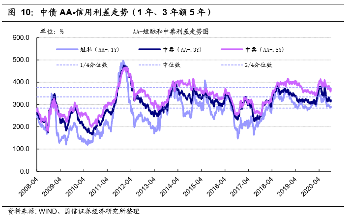 然后对应的历史分位数为:AAA等级中,1年、3年和5年信用利差分别为1%、9%和21%;AA+等级中,1年、3年和5年信用利差分别为0%、7%和12%;AA等级中,1年、3年和5年信用利差分别为1%、7%和7%;AA-等级中,1年、3年和5年信用利差分别为62%、56%和72%(数据样本为2008年4月22日至2020年10月23日)。