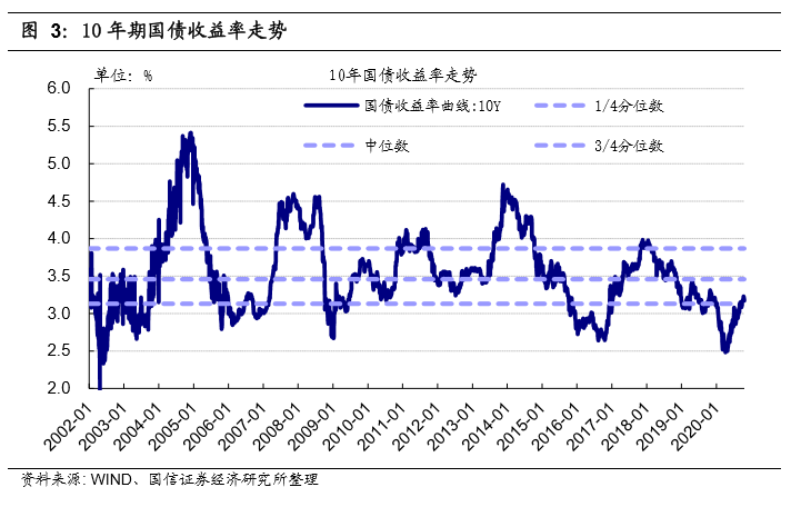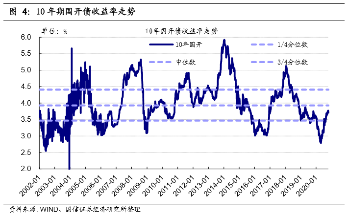 截至2020年10月23日,1年期国债收益率、5年国债收益率、10年国债收益率以及10年期国开债收益率分为为2.68%、3.00%、3.20%和3.72%,它们的历史分位数分别为56%、43%、31%和40%(2002年以来的所有数据为样本)。