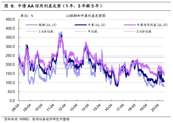 中债估值曲线来看,投资级信用利差均在1/4分位数以下,AA-信用利差在3/4分位数