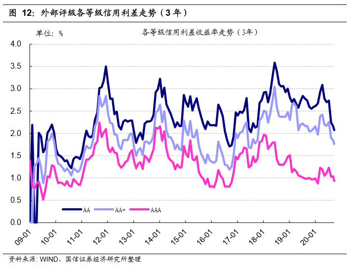 外部评级方面,我们统计的非金融企业债券各年度评级下调占比分别为:2018年为0.9%,2019年为1%,2020年为0.6%,绝对水平来看明显低于中债隐含评级下调占比。另外违约率方面,2018年为0.62%,2019年为0.67%,2020年为0.48%,违约风险仍可控。