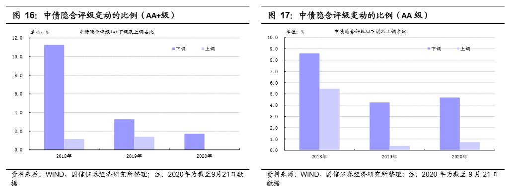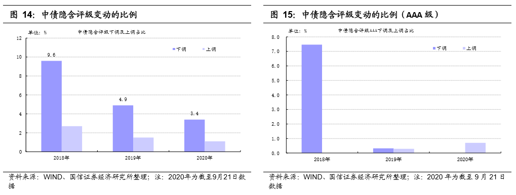 从可获得的数据来看,非金融企业信用债中,2018年全体样本的中债市场隐含评级下调的比例为9.6%,2019年为4.9%,2020年为3.4%。然后2019年和2020年中债隐含评级AAA的下调占比明显下降,但是隐含评级AA+和AA的占比仍不低。因此,考虑单只信用债的资本利得的话,其所属的中债市场隐含评级下调是重要风险点。