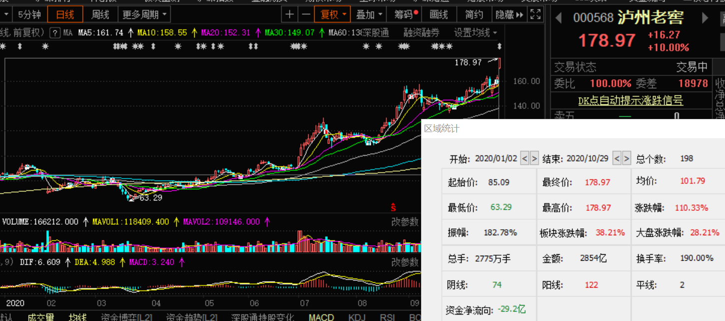 三季度净利大增近5成的泸州老窖,今日领涨白酒股,早盘10%率先拉升封板,报收178.97元,创下历史新高,年内涨幅已达110.33%,最新市值2621亿元。