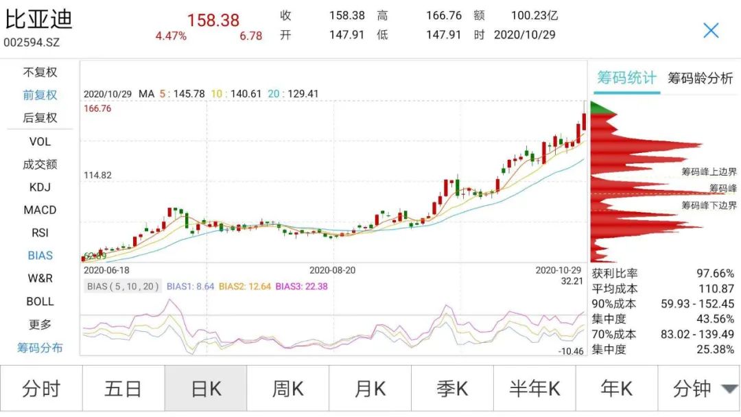 10月29日,比亚迪AH股纷纷刷新纪录高位,A股盘中一度触及涨停价166.76元/股,截至收盘报158.38元/股,涨幅4.47%,当日成交额超100亿元,市值超过4100亿元,坐稳中国新能源汽车“一哥”的位置。