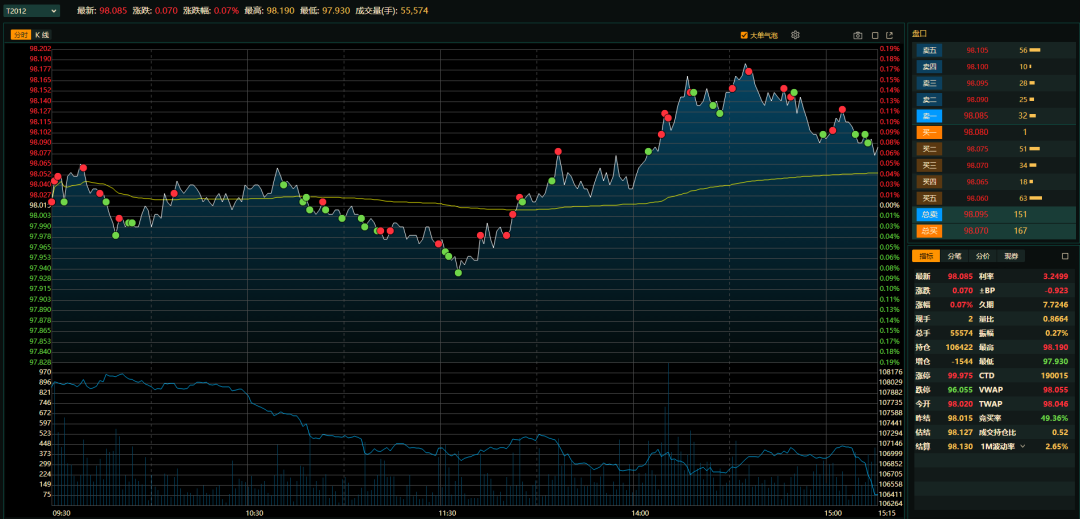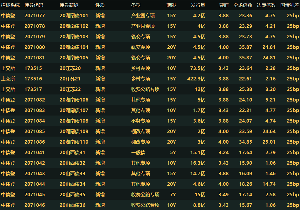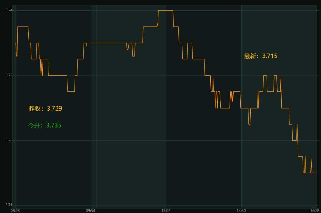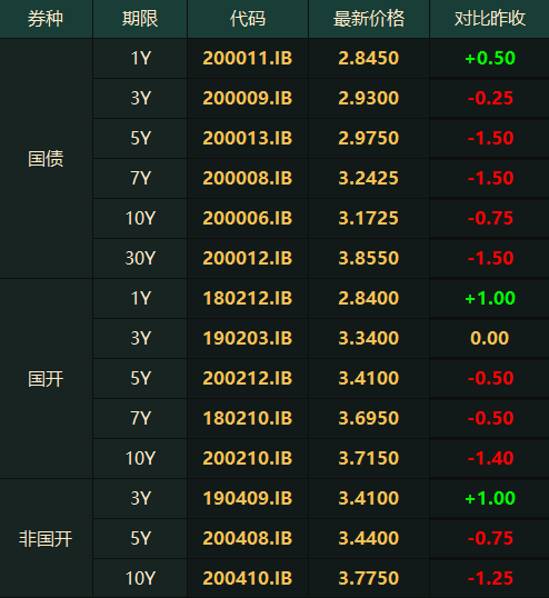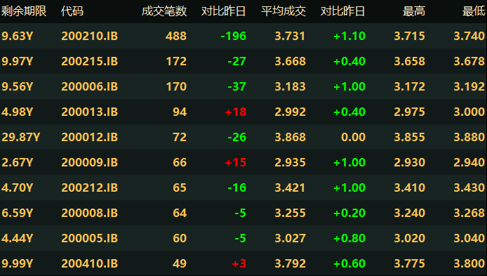 国债期货小幅收涨。截至收盘,10年期主力合约涨0.07%,5年期主力合约涨0.03%,2年期主力合约涨0.01%。沪指震荡下挫,收于3224.53,跌1.47%。剩余期限9.63Y 20国开10 收益率震荡下行,最高成交在3.74%,最低成交在3.7225%,实时行情3.715%,较昨收下行1.4BP。今日成交488笔(昨日成交684笔)。