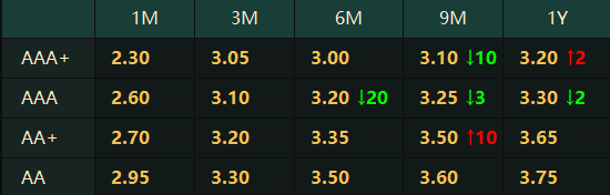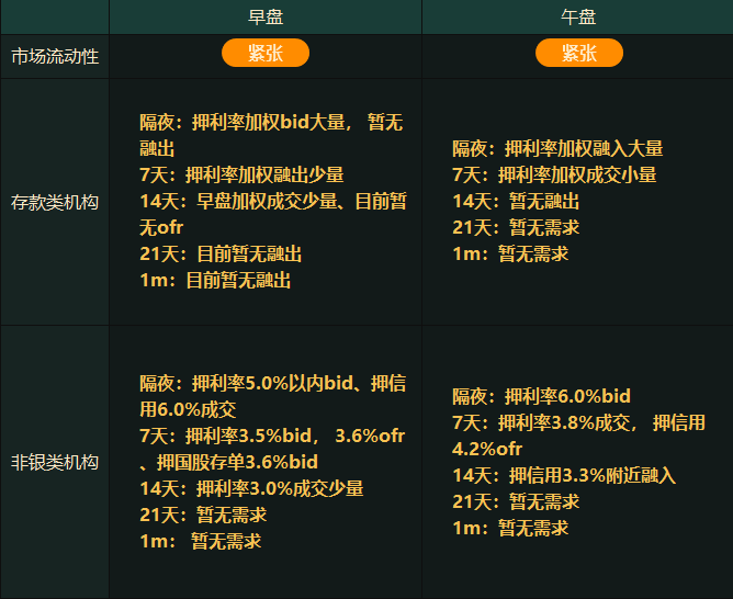 今日市场流动性紧张。午后非银类机构隔夜资金押利率6.0%bid;NCD方面,1M期限国股 TRD在 2.80%;一级方面,1Y期限国股发行在 3.20%。
