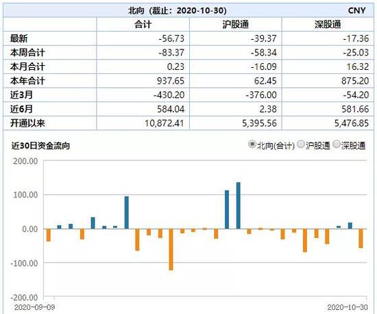 10月30日,在外围市场扰动下,A股午后变脸,三大股指集体下挫,北向资金全天净流出超56亿元。