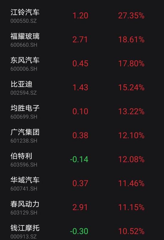 Wind数据显示,本周(10月26日至10月30日)申万28个一级行业中,汽车板块再度以3.91%涨幅领涨,其中江铃汽车本周大涨27.35%,福耀玻璃、东风汽车、比亚迪、均胜电子等多只个股周涨幅在10%以上。从月度表现看,10月汽车板块大涨11.59%,月线已是5个月上涨。