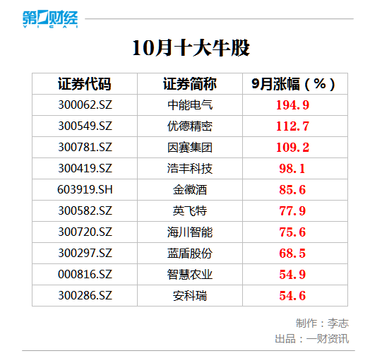 原标题:10月十大牛股新鲜出炉 中能电气近2倍涨幅问鼎榜首