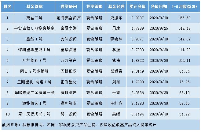 私募先锋榜(大湾区)2020年1-9月复合策略排行榜(制表:投资快报股市广播)