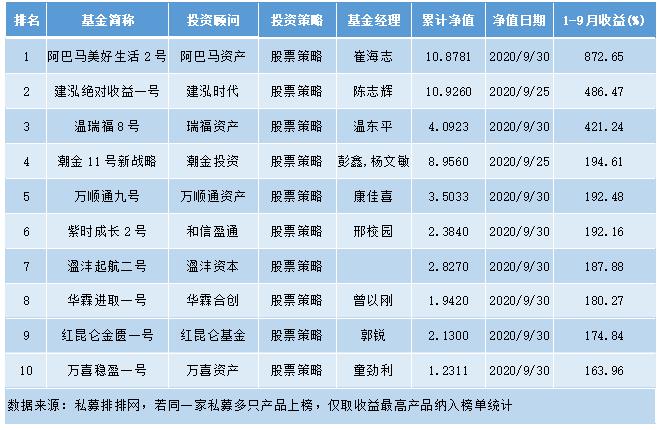 私募先锋榜(大湾区)2020年1-9月前十排行榜(制表:投资快报股市广播)