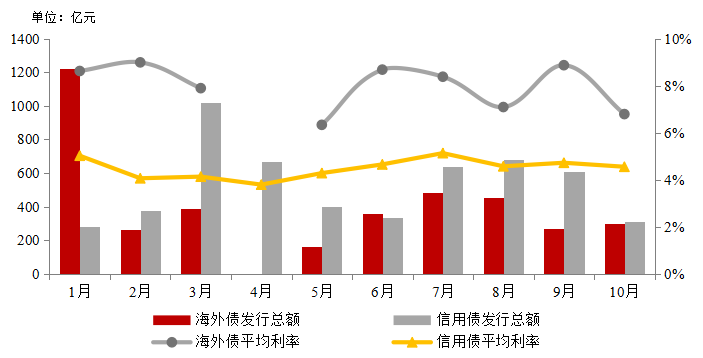 图:2020年1-10月房地产行业海外债、信用债发行情况