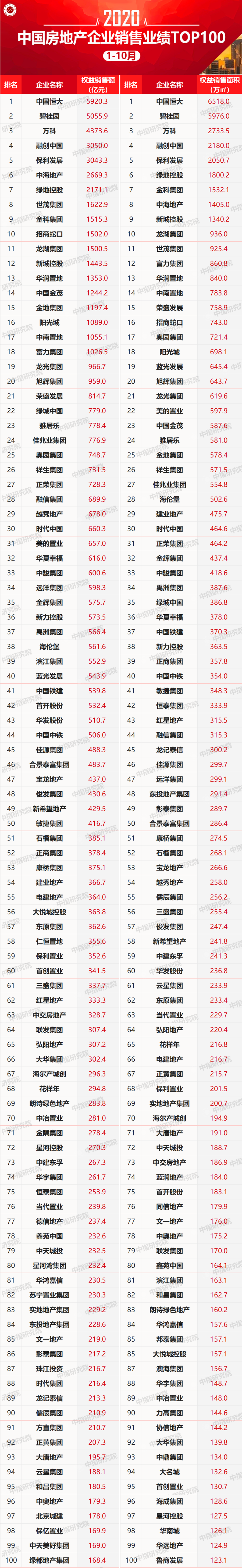 原标题:2020年1-10月中国房地产企业销售业绩TOP100