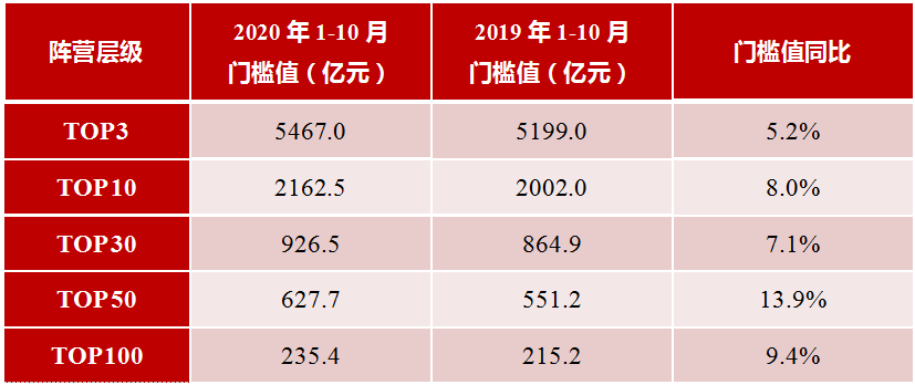 2020年1-10月,TOP100门槛值为235.4亿元。其中,TOP3房企门槛值为5467.0亿元,较上年增长5.2%;TOP10房企门槛值为2162.5亿元,较上年增长8.0%;TOP30房企门槛值为926.5亿元,较上年增长7.1%;TOP50房企及TOP100房企门槛值分别为627.7亿元、235.4亿元,同比分别增长13.9%和9.4%。