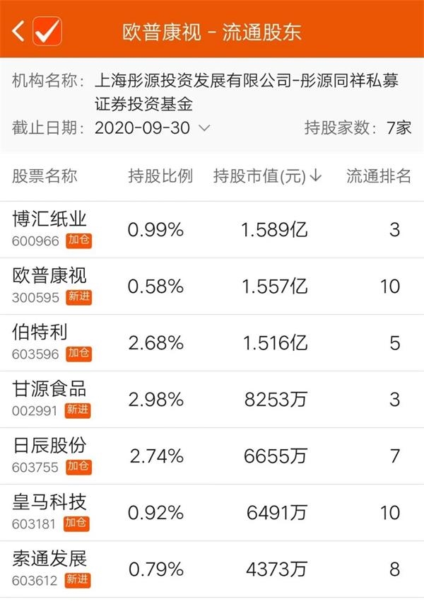 另外,今年前三季度的绩优百亿级私募调仓路径也颇受关注,数据显示,彤源投资旗下产品现身欧普康视、甘源食品、日辰股份、皇马科技等多只股票的前十大流通股东名单。