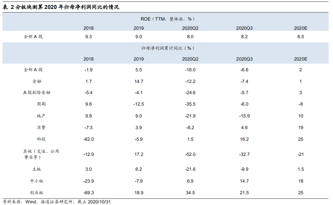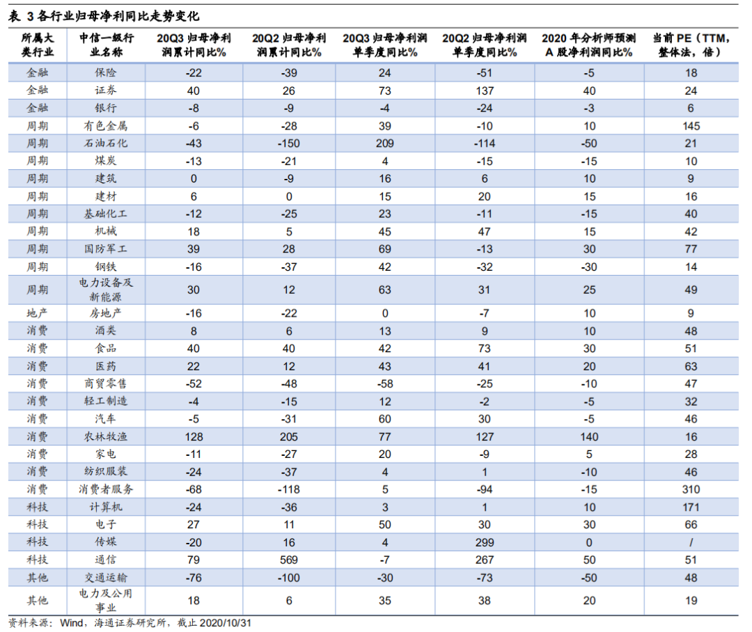 【海通策略】业绩回升,全年转正 ——20年三季报点评(荀玉根(金麒麟分析师)、李影(金麒麟分析师)、郑子勋(金麒麟分析师))
