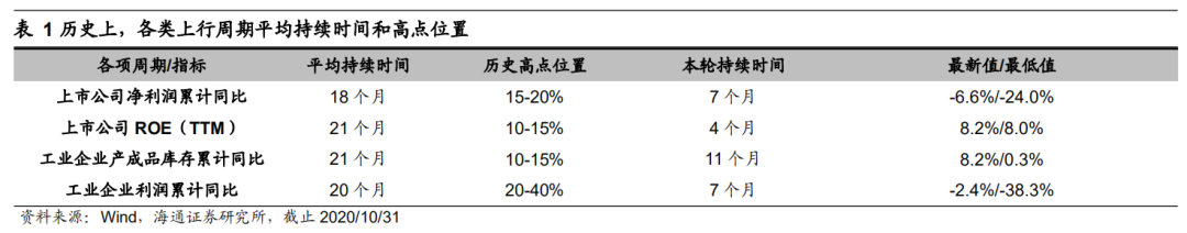 微观角度看,预计2020年A股净利润同比为0~5%。前文所述最新披露的A股三季报业绩也显示基本面开始回升,我们认为未来回升趋势还将延续,不会轻易终止。观察2002年以来我国经济库存周期和A股盈利周期,发现两者走势大致趋同,而且平均持续39个月。参考A股业绩周期,2002年以来A股经历了5轮归母净利润增速和ROE上行周期,分别平均持续6、7个季度。目前A股处在第6轮盈利周期上行期,这次A股归母净利增速从20Q1见底后开始回升,已经持续了2个季度,ROE从20Q2低点开始回升,已经持续了1个季度。按照历史经验外推,预计A股净利同比增速将持续回升至2021年中,ROE持续回升至2021年年底。对于2020年A股净利润增速,考虑全年净利润占比分布变化,我们根据2011-2019年三季度净利润占全年的比重和20年三季报业绩,推算净利同比增速和ROE,全部A股2011-19年三季度归母净利润占比波动区间(均值)76.2%~86.7%(79.5%)。综合以上考虑,我们推算20年全年A股预测净利同比为5%,对应ROE为8.5%。另外,我们汇总海通证券各行业证券分析师自下而上的预测,推算出2020年全部A股净利同比为2%。综上所述,我们认为疫情对业绩冲击的至暗时刻已过去,全年业绩逐季改善,需等待盈利回升,2020年A股净利同比有望达到0~5%左右,ROE达到8.5%左右。展望2021年,我们认为盈利回升趋势延续,结合库存周期和盈利周期,我们认为A股单季度净利同比增速高点在出现在21Q1,净利累计同比增速将在2021上半年保持高位,A股ROE将持续回升至2021年底。