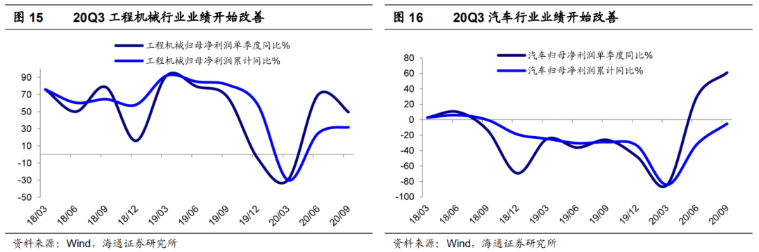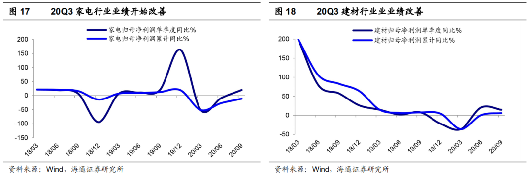 上半年消费和科技业绩较优,Q3早周期行业业绩大幅改善。今年前三季度业绩表现较好的行业具体如下:农林牧渔20Q3/20Q2/20Q1归母净利累计同比为128%/205%/483%,通信为79%/569%/-45%,食品为40%/40%/26%,证券为40%/26%/-23%,电力设备及新能源为30%/12%/-20%。电子为27%/11%/-16%,医药为22%/12%/-16%,酒类为8%/6%/5%。今年上半年业绩表现优异的行业主要集中在消费和科技,而周期类行业业绩较差。这是因为今年年初疫情爆发直接刺激了对医疗物资和服务的需求,疫情期间农产品和食品是必需消费品,同时隔离防控措施也刺激了信息经济大发展。而疫情期间居民出行受限,从而导致交通运输、石油石化等周期行业业绩恶化。进入三季度后,经济环境开始发生了明显变化,我国疫情防控取得了显著成效,全国已经逐步开展正常的经济生产活动,早周期行业业绩开始改善。具体而言,工程机械20Q3/20Q2/20Q1归母净利单季度同比为49%/70%/-30%,汽车为60%/30%/-84%,建材为15%/20%/-36%,家电为20%/-9%/-51%,石油石化为209%/-114%/-203%,钢铁为42%/-32%/-46%,轻工制造为12%/-2%/-33%。按照这个逻辑推演,我们认为四季度后周期行业业绩有望继续改善,比如金融、地产等。