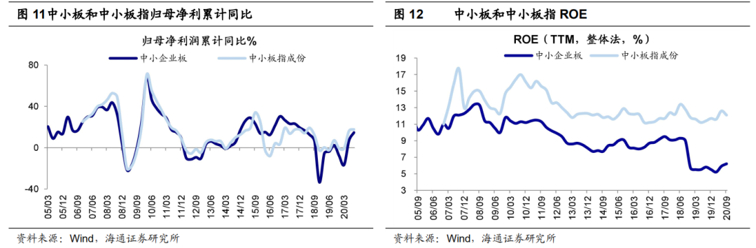 20Q3中小板归母净利累计同比14.7%,而20Q2为6.9%。观察中小板整个板块板块及中小板指的情况,我们发现中小板目前仍处在盈利加速期:20Q3/20Q2/20Q1/19Q4中小板归母净利累计同比为14.7%/6.9%/-16.6%/-7.9%,扣非后的归母净利润同比为25.0%/19.8%/-6.5%/2.8%。20Q3/20Q2/20Q1/19Q4中小板ROE(TTM,整体法,下同)为6.2%/5.9%/5.2%/5.5%,低于2005年以来的均值9.5%,处于05年以来从低到高12.5%的分位。20Q3/20Q2/20Q1/19Q4中小板指归母净利累计同比为17.7%/16.2%/-0.7%/-0.8%,高于2005年以来的均值15.5%,处于05年以来从低到高64.3%的分位。20Q3/20Q2/20Q1/19Q4中小板指ROE为12.1%/12.6%/11.6%/11.7%,低于2005年以来的均值13.1%,处于05年以来从低到高32.1%的分位。我们预计20年中小板归母净利润同比增速为18%,对应ROE为7%。