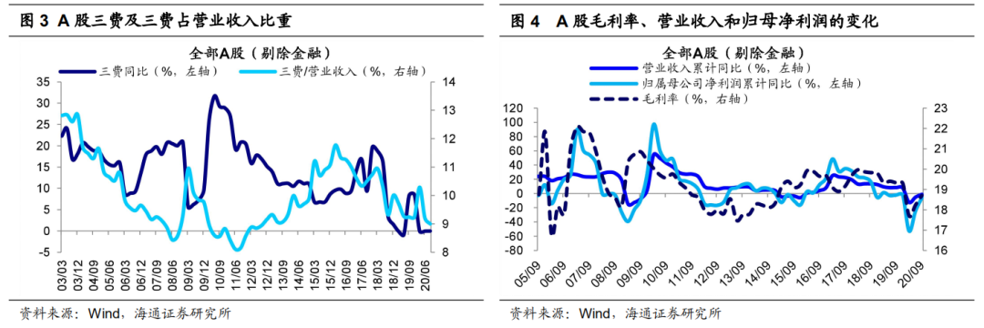 需求回暖带动业绩回升,20Q3全部A股净利润累计同比增速为-6.6%。截至10月31日,99.9%的A股上市公司公布了20年三季报。分析Q3数据,从累计同比增速看,Q3再度回升:20Q3/20Q2/20Q1/19Q4全部A股归属母公司净利累计同比分别为-6.6%/-18.0%/-24.0%/5.5%,剔除金融后为-5.7%/-24.6%/-52.4%/-4.1%。从单季度同比增速看,Q3已大幅回正:20Q3/20Q2/20Q1/19Q4全部A股归属母公司净利润单季度同比分别为17.4%/-12.4%/-24.0%/-3.8%,剔除金融后为32.0%/-0.8%/-52.4%/-22.3%。在年初疫情冲击下,一季度A股归母净利同比增速接近历史最低点,随着疫情逐步得到控制和经济刺激政策落地,二、三季度A股归母净利同比增速逐季回升。回顾历史,A股归母累计净利同比和工业企业利润总额累计同比走势大致趋同,20Q3/20Q2/20Q1/19Q4规模以上工业企业利润累计同比分别为-2.4%/-12.8%/-36.7%/-3.3%,业绩收窄的趋势与上市公司一致。进一步考察这次归母净利润的变动原因,我们可以发现利润的大幅回升主要源自需求端的回暖:20Q3/20Q2/20Q1/19Q4全部A股营业收入累计同比增速分别为0.4%/-2.9%/-8.8%/8.6%,剔除金融后为-1.1%/-5.1%/-12.3%/7.7%。需求端的回暖也带动着产品价格的修复,PPI当月同比增速在5月见底-3.7%后回升至9月的-2.1%,企业的毛利率也随之走高:20Q3/20Q2/20Q1/19Q4全部A股毛利率分别为18.7%/18.2%/17.8%/19.3%,剔除金融后为18.7%/18.2%/17.7%/19.3%。但从营收同比和毛利率看,需求尚未恢复至疫情前的水平。此外,三费费率在Q3依旧保持低位:20Q3/20Q2/20Q1/19Q4全部A股的管理费用率分别为6.8%/6.8%/7.3%/6.9%。20Q3/20Q2/20Q1/19Q4全部A股的财务费用率分别为1.5%/1.6%/1.9%/1.5%。20Q3/20Q2/20Q1/19Q4全部A股的销售费用率分别为4.0%/4.0%/4.3%/4.3%。