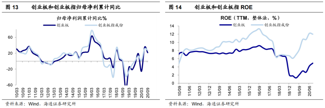 20Q3创业板归母净利累计同比21.5%,而20Q2为34.5%。观察创业板整个板块及创业板指的情况,我们发现创业板目前仍处在盈利加速期:20Q3/20Q2/20Q1/19Q4创业板归母净利累计同比为21.5%/34.5%/-25.6%/18.9%,高于2005年以来的均值12.5%。剔除温氏股份、乐视以及非经常性损益后,创业板扣非归母净利润同比为30.3%/13.3%/-28.3%/122.7%,三季度利润增速继续回升。20Q3/20Q2/20Q1/19Q4创业板ROE为4.9%/4.2%/2.7%/3.0%,低于2010年以来的均值6.7%,处于10年以来从低到高18.1%的分位。20Q3/20Q2/20Q1/19Q4创业板指归母净利累计同比为27.1%/31.0%/1.6%/12.6%,高于2010年以来的均值13.5%,扣非后的归母净利润同比增速为35.8%/41.5%/18.0%/104.7%。20Q3/20Q2/20Q1/19Q4创业板指ROE为12.0%/12.2%/10.7%/10.7%,高于2010年以来的均值9.2%,处于10年以来从低到高89.3%的分位。整体上,我们预计20年创业板归母净利润同比增速为25%,对应ROE为6%。